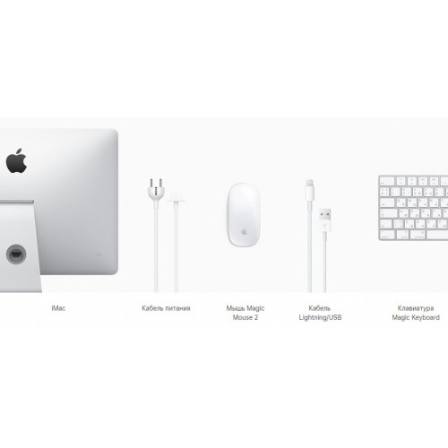 21,5-дюймовый дисплей моноблока Apple iMac 21.5 Retina 4K 2019 (MRT42) имеет название Retina 4K, он оснащен IPS матрицей с LED подсветкой, яркостью 500 кд/м² и разрешением 4096 x 2304 пикселей. За его работоспособностью следит видеокарта AMD Radeon Pro 560X 4 ГБ GDDR5, а она, конечно же, тесно взаимосвязана с 6-ядерным процессором Intel Core i5 8-го поколения с частотой 3,0 ГГц, Turbo Boost до 4,1 ГГц и 8 ГБ оперативной памяти DDR4 2666 МГц, тогда как за хранение информации отвечает 1TB Fusion Drive. Также, производитель позаботился о наличии внутри устройства модулей Wi-Fi 802.11ac, Bluetooth 4.2, HD-вебкамеры FaceTime, аудио стереодинамов и микрофона, а наружу вывел четыре порта USB 3.0 (совместимы с USB 2.0), порт 10/100/1000 BASE‑T Gigabit Ethernet (разъем RJ‑45), кардридер для карт SDXC, два порта Thunderbolt 3 (USB‑C) и выход 3,5 мм для наушников.